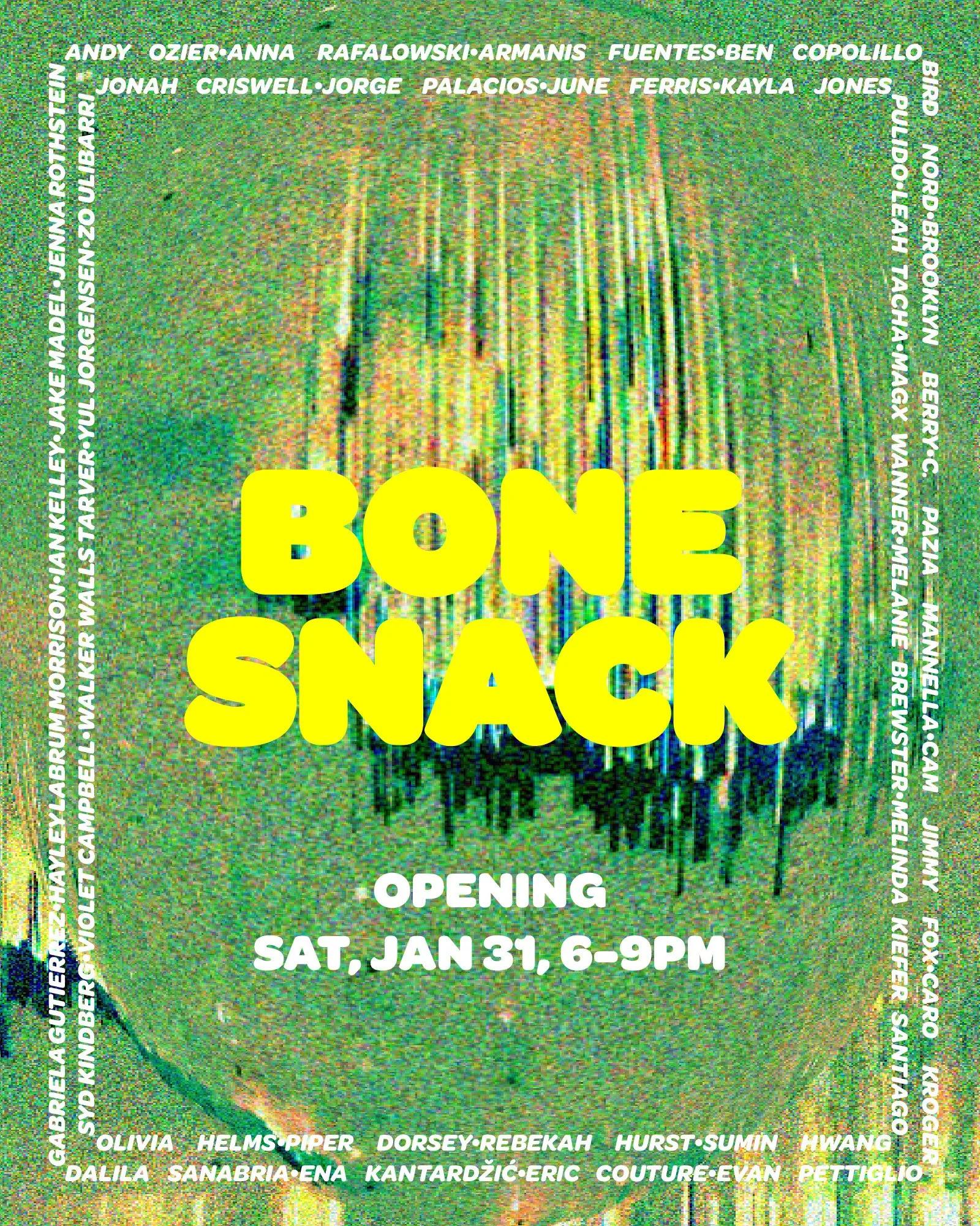 100,000,000 is pleased to present Bone Snack, a group exhibition of thirty-six artists chosen from 100,000,000’s first open call.